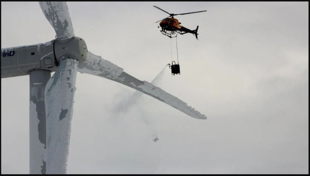Off-shore wind turbines and those operating in northern climates are fitted with heating elements that melt off the ice before it can retard performance. Such modifications are costly but necessary.