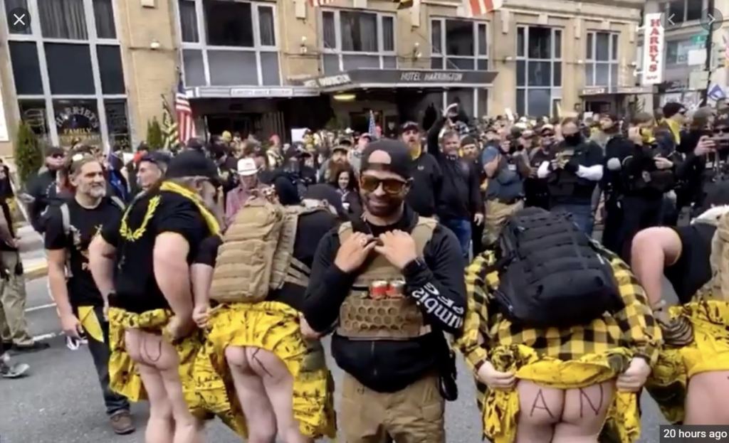 When the courts won’t roll over and hand you the election, what’s left for Trump? Sedition, of course. Trump encouraged the right wing militias to take to the streets. One group, composed of pitiful losers called the Proud Boys, showed up in DC and tried to mix it up with the civilians there. Remember, none of these guys could get a woman to talk to them without swiping their credit card. Here’s a photograph of these weekend Cos-players showing their class and intelligence to the American public.