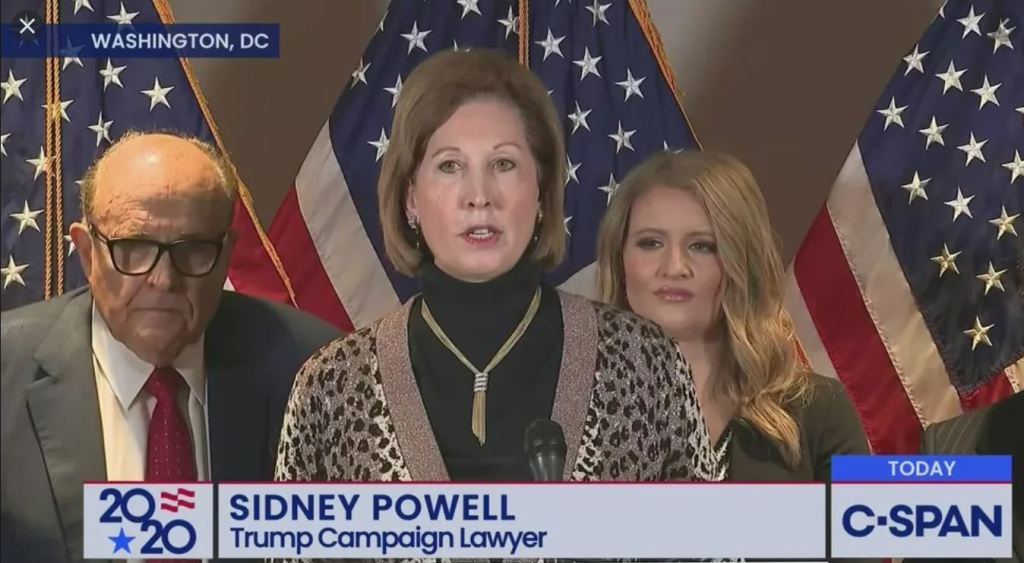 Another comedy icon on the Trump circuit is the dour-faced lawyer and conspiracy-monger Sidney Powell. Ms. Powell promised to “Release the Kracken” when she got to court (Hey, that’s Liam Neeson’s line from “Clash of the Titans,” he should sue!). Anyway, when Barrister Powell got to Court, there was a small problem – she had no evidence whatsoever. She was laughed out of court in Michigan and Georgia. In fact, it was so bad that the Trump Campaign disowned her. All of Trump’s lawsuits, save one, were quickly dismissed, many by Republican and Trump-appointed Judges. Here’s Powell in action recently.