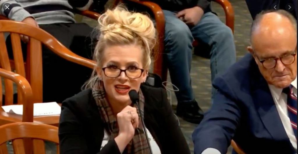 Rudy Giuliani has been comedy gold, at least for Saturday Night Live. Rudy has been staging a series of fake Hearings, basically a bunch of disappointed Republicans in a hotel conference rooms. In one hilarious outing in Michigan, he performed with Mellissa Carone, a clearly inebriated witness, who babbled on about nothing in particular. Apparently, nobody vetted Ms. Carone, who had recently pled guilty and served probation for sending unwanted sex videos to her lover’s ex-wife. Here’s a photograph of Rudy’s star witness (or should I say witless).
